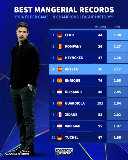 阿尔特塔以场均2.17分排在历史第四,他一共执教了36场欧冠,战绩为24胜6平6负。他执教的第一场欧冠是2023年对阵朗斯。