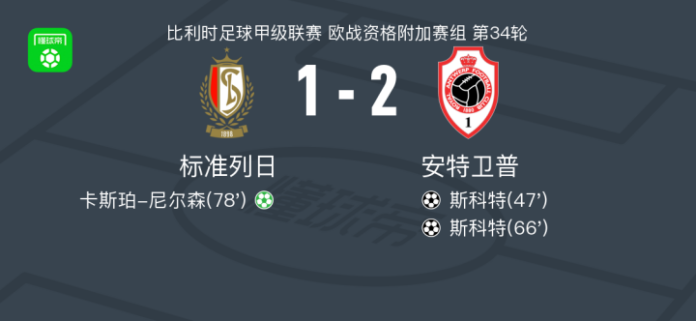 北京时间4月22日比利时足球甲级联赛 欧战资格附加赛组 第34轮,标准列日主场对阵安特卫普。标准列日卡斯珀-尼尔森破门。安特卫普斯科特梅开二度。最终比分标准列日 1–2 安特卫普。