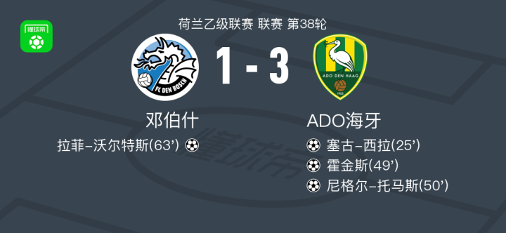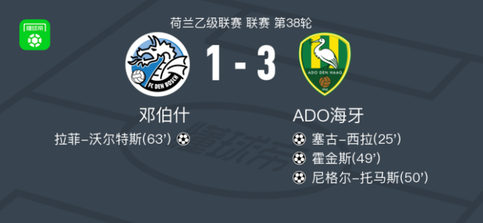 北京时间4月25日荷兰乙级联赛 联赛 第38轮,邓伯什主场对阵ADO海牙。邓伯什拉菲-沃尔特斯破门。ADO海牙塞古-西拉破门,霍金斯破门,尼格尔-托马斯破门。最终比分邓伯什 1–3 ADO海牙。