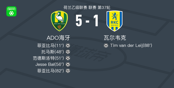 北京时间4月18日荷兰乙级联赛 联赛 第37轮,ADO海牙主场对阵瓦尔韦克。ADO海牙菲亚比马梅开二度,托马斯破门,范德斯洛特破门,Jesse Bal破门。瓦尔韦克Tim van der Leij破门。最终比分ADO海牙 5–1 瓦尔韦克。