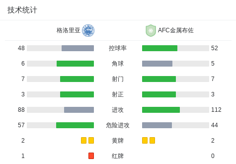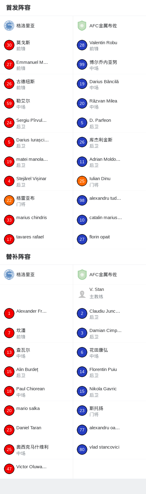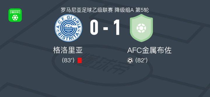 AFC金属布佐1-0格洛里亚取罗乙5连胜 足球资讯 发布时间: 2026年4月25日 阅读时间: 少于1 分钟 FacebookXPinterestWhatsApp AFC金属布佐1-0格洛里亚取罗乙5连胜 北京时间4月25日罗马尼亚足球乙级联赛 降级组A 第5轮,格洛里亚主场对阵AFC金属布佐。最终比分格洛里亚 0–1 AFC金属布佐。 点击查看本场比赛详细数据>> 精彩瞬间 第82分钟,AFC金属布佐球员打入一球。 第83分钟,格洛里亚球队吃到红牌。 球队阵容 技术统计 FacebookXPinterestWhatsApp 1823100https://1823100.com 红单推荐 023 英超 阿森纳vs纽卡斯尔 红单推荐 2026年4月25日 016 英超 狼队vs热刺 红单推荐 2026年4月25日 013 英超 桑德兰vs诺丁汉 红单推荐 2026年4月24日 014 西甲 贝蒂斯vs皇马 红单推荐 2026年4月24日 005 西甲 巴列卡诺vs西班牙人 红单推荐 2026年4月23日 热门资讯 012 英超 诺丁汉森林vs阿斯顿维拉 红单推荐 2026年4月12日 001 欧联杯 塞尔塔vs弗莱堡 红单推荐 2026年4月16日 014 西甲 贝蒂斯vs皇马 红单推荐 2026年4月24日 002 欧联 诺丁汉vs波尔图 红单推荐 2026年4月16日 三人20+!火箭21分逆转太阳7连胜 KD24分阿门22+11+8 篮球资讯 2026年4月8日