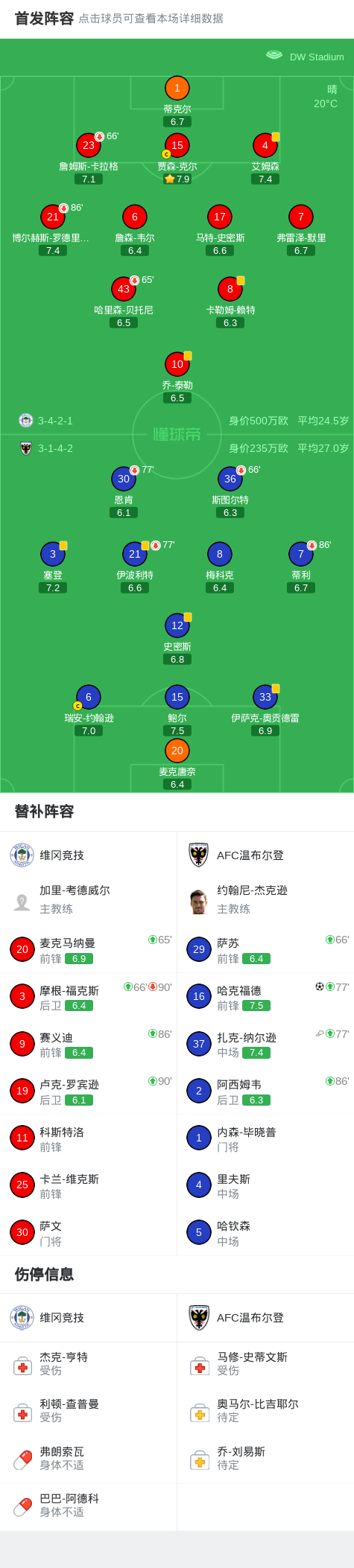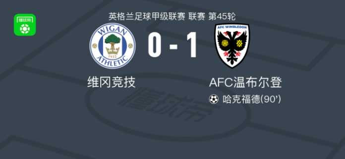 AFC温布尔登1-0维冈竞技,哈克福德绝杀 足球资讯 发布时间: 2026年4月26日 阅读时间: 少于1 分钟 FacebookXPinterestWhatsApp AFC温布尔登1-0维冈竞技,哈克福德绝杀 北京时间4月25日英格兰足球甲级联赛 联赛 第45轮,维冈竞技主场对阵AFC温布尔登。AFC温布尔登哈克福德破门。最终比分维冈竞技 0–1 AFC温布尔登。 点击查看本场比赛详细数据>> 点击查看英甲完整积分榜>> 精彩瞬间 第90分钟,AFC温布尔登球员扎克-纳尔逊助攻哈克福德打入一球。 球队阵容 技术统计 FacebookXPinterestWhatsApp 1823100https://1823100.com 红单推荐 021 西甲 奥萨苏纳vs塞维利亚 红单推荐 2026年4月26日 013 英足总杯 切尔西(中)vs利兹联 红单推荐 2026年4月26日 023 英超 阿森纳vs纽卡斯尔 红单推荐 2026年4月25日 016 英超 狼队vs热刺 红单推荐 2026年4月25日 013 英超 桑德兰vs诺丁汉 红单推荐 2026年4月24日 热门资讯 官方:贺希宁当选本赛季CBA常规赛MVP 篮球资讯 2026年4月26日 马竞官方:巴里奥斯左大腿肌肉受伤,回归时间取决于恢复情况 足球资讯 2026年4月26日 阿贾克斯女足0-0费耶诺德女足,秋色平分 足球资讯 2026年4月26日 阿拉德纺织厂0-0康斯坦察灯塔,平分秋色 足球资讯 2026年4月26日 额尔齐斯河鄂木斯克1-1米阿斯,Grigoriy Borisenko破僵,Bilal Bilalov扳平 足球资讯 2026年4月26日