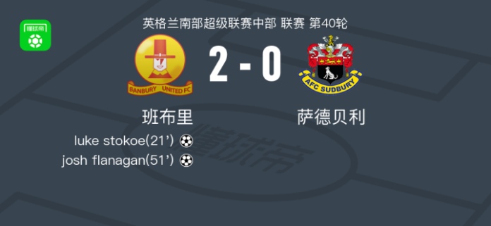 北京时间4月11日英格兰南部超级联赛中部 联赛 第40轮,班布里主场对阵萨德贝利。班布里luke stokoe破门,josh flanagan破门。最终比分班布里 2–0 萨德贝利。