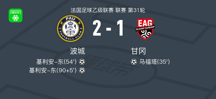 北京时间4月18日法国足球乙级联赛 联赛 第31轮,波城主场对阵甘冈。波城基利安-东梅开二度。甘冈马福塔破门。最终比分波城 2–1 甘冈。