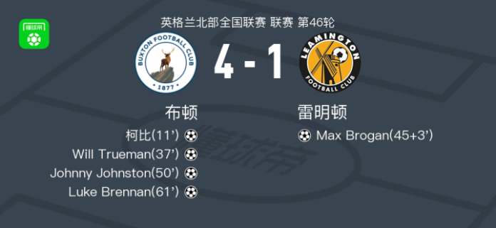 北京时间4月25日英格兰北部全国联赛 联赛 第46轮,布顿主场对阵雷明顿。布顿柯比破门,Will Trueman破门,Johnny Johnston破门,Luke Brennan破门。雷明顿Max Brogan破门。最终比分布顿 41 雷明顿。