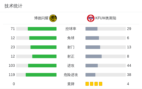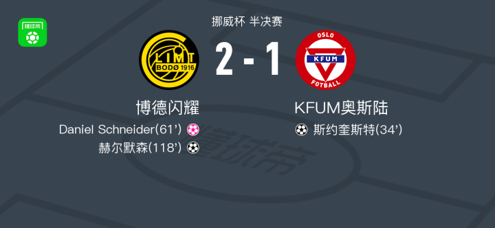 北京时间4月23日挪威杯 半决赛,博德闪耀对阵KFUM奥斯陆。博德闪耀赫尔默森破门。KFUM奥斯陆斯约奎斯特破门,Daniel Schneider自摆乌龙。最终比分博德闪耀 2–1 KFUM奥斯陆。