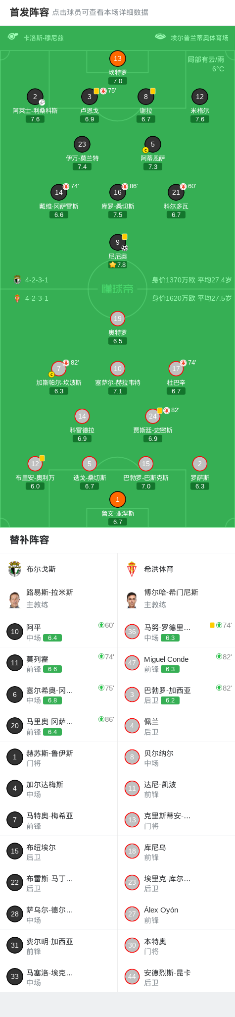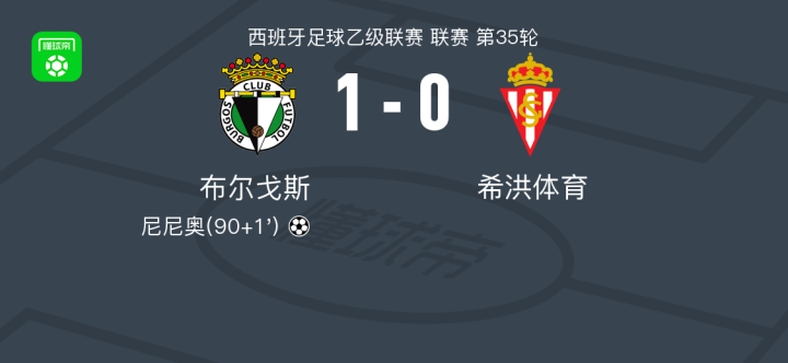 布尔戈斯1-0希洪体育,尼尼奥一剑封喉 足球资讯 发布时间: 2026年4月12日 阅读时间: 少于1 分钟 FacebookXPinterestWhatsApp 布尔戈斯1-0希洪体育,尼尼奥一剑封喉 北京时间4月11日西班牙足球乙级联赛 联赛 第35轮,布尔戈斯主场对阵希洪体育。布尔戈斯尼尼奥破门。最终比分布尔戈斯 1–0 希洪体育。 点击查看本场比赛详细数据>> 点击查看西乙完整积分榜>> 精彩瞬间 下半场补时第1分钟,布尔戈斯球员阿莱士-利桑科斯助攻尼尼奥打入一球。 球队阵容 技术统计 FacebookXPinterestWhatsApp 1823100https://1823100.com 红单推荐 023 英超 阿森纳vs纽卡斯尔 红单推荐 2026年4月25日 016 英超 狼队vs热刺 红单推荐 2026年4月25日 013 英超 桑德兰vs诺丁汉 红单推荐 2026年4月24日 014 西甲 贝蒂斯vs皇马 红单推荐 2026年4月24日 005 西甲 巴列卡诺vs西班牙人 红单推荐 2026年4月23日 热门资讯 013 英超 桑德兰vs诺丁汉 红单推荐 2026年4月24日 三人20+!火箭21分逆转太阳7连胜 KD24分阿门22+11+8 篮球资讯 2026年4月8日 约基奇第198次三双!掘金大胜灰熊豪取10连胜 穆雷26+7+5 篮球资讯 2026年4月9日 005 西甲 巴列卡诺vs西班牙人 红单推荐 2026年4月23日 002 欧协联 巴列卡诺vs雅典AEK 红单推荐 2026年4月9日