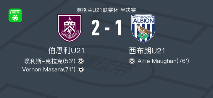 北京时间4月14日英格兰U21联赛杯 半决赛,伯恩利U21对阵西布朗U21。伯恩利U21埃利斯-克拉克破门,Vernon Masara破门。西布朗U21Alfie Maughan破门。最终比分伯恩利U21 2–1 西布朗U21。