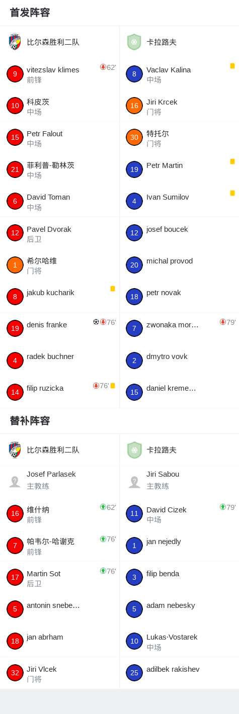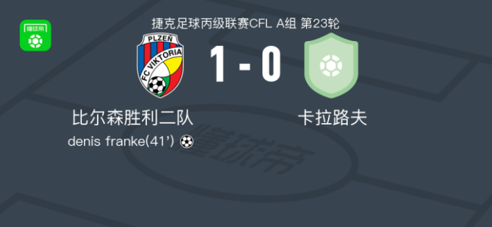 比尔森胜利二队1-0卡拉路夫,denis franke一锤定音 足球资讯 发布时间: 2026年4月12日 阅读时间: 少于1 分钟 FacebookXPinterestWhatsApp 比尔森胜利二队1-0卡拉路夫,denis franke一锤定音 北京时间4月12日捷克足球丙级联赛CFL A组 第23轮,比尔森胜利二队主场对阵卡拉路夫。比尔森胜利二队denis franke破门。最终比分比尔森胜利二队 1–0 卡拉路夫。 点击查看本场比赛详细数据>> 精彩瞬间 第41分钟,比尔森胜利二队球员denis franke打入一球。 球队阵容 技术统计 FacebookXPinterestWhatsApp 1823100https://1823100.com 红单推荐 007 意杯 国际米兰vs科莫 红单推荐 2026年4月21日 005 西甲 毕尔巴鄂竞技vs奥萨苏纳 红单推荐 2026年4月21日 001 意甲 莱切vs佛罗伦萨 红单推荐 2026年4月20日 003 英超 水晶宫vs西汉姆联 红单推荐 2026年4月20日 019 英超 曼城vs阿森纳 红单推荐 2026年4月19日 热门资讯 001 欧联杯 塞尔塔vs弗莱堡 红单推荐 2026年4月16日 002 欧联 诺丁汉vs波尔图 红单推荐 2026年4月16日 雷帕斯3-2逆转基芬,oliver helttunen、Timur Saltykov破门 足球资讯 2026年4月19日 还能这么玩,奥德里奥索拉夺冠后把女儿塞进了国王杯奖杯里 足球资讯 2026年4月20日 马竞官方:为避免受伤,卢克曼和瑟洛特暂时进行单独训练 足球资讯 2026年4月20日
