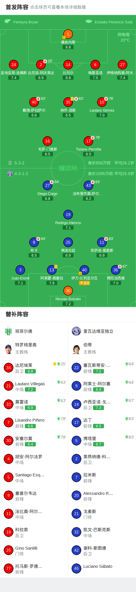班菲尔德0-0里瓦达维亚独立,秋色平分 足球资讯 发布时间: 2026年4月21日 阅读时间: 少于1 分钟 FacebookXPinterestWhatsApp 班菲尔德0-0里瓦达维亚独立,秋色平分 北京时间4月21日阿根廷足球超级联赛 春季联赛 第15轮,班菲尔德主场对阵里瓦达维亚独立。最终比分班菲尔德 0–0 里瓦达维亚独立。 点击查看本场比赛详细数据>> 点击查看阿超完整积分榜>> 球队阵容 技术统计 FacebookXPinterestWhatsApp 1823100https://1823100.com 红单推荐 001 意甲 莱切vs佛罗伦萨 红单推荐 2026年4月20日 003 英超 水晶宫vs西汉姆联 红单推荐 2026年4月20日 019 英超 曼城vs阿森纳 红单推荐 2026年4月19日 007 英冠 伊普斯维奇vs米德尔斯堡 红单推荐 2026年4月19日 009 挪超 博德闪耀vs奥勒松 红单推荐 2026年4月18日 热门资讯 雷帕斯3-2逆转基芬,oliver helttunen、Timur Saltykov破门 足球资讯 2026年4月19日 001 欧联杯 塞尔塔vs弗莱堡 红单推荐 2026年4月16日 002 欧联 诺丁汉vs波尔图 红单推荐 2026年4月16日 还能这么玩,奥德里奥索拉夺冠后把女儿塞进了国王杯奖杯里 足球资讯 2026年4月20日 马竞官方:为避免受伤,卢克曼和瑟洛特暂时进行单独训练 足球资讯 2026年4月20日