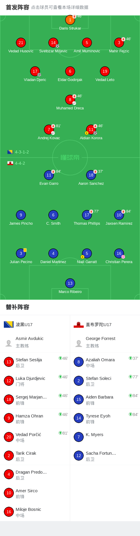 北京时间4月26日欧洲U17青年锦标赛 资格赛B联赛,波黑U17对阵直布罗陀U17。波黑U17Svetozar Miljevic破门,Aldian Korora破门,Vladan Djeric破门。直布罗陀U17Christian Perera自摆乌龙。最终比分波黑U17 40 直布罗陀U17。