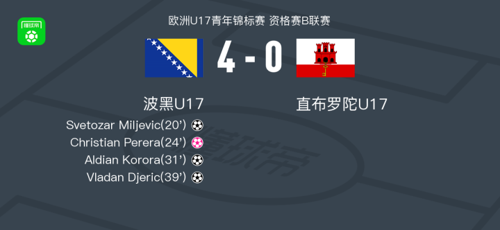 波黑U17 4-0大胜直布罗陀U17,Vladan Djeric破门,Aldian Korora建功