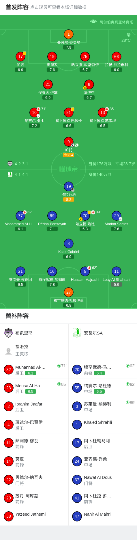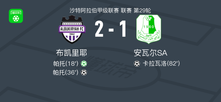 北京时间4月14日沙特阿拉伯甲级联赛 联赛 第29轮,布凯里耶主场对阵安瓦尔SA。布凯里耶帕托梅开二度。安瓦尔SA卡拉瓦洛破门。最终比分布凯里耶 2–1 安瓦尔SA。