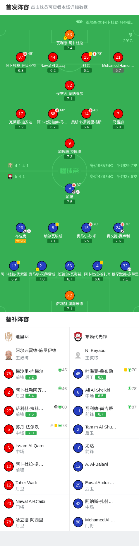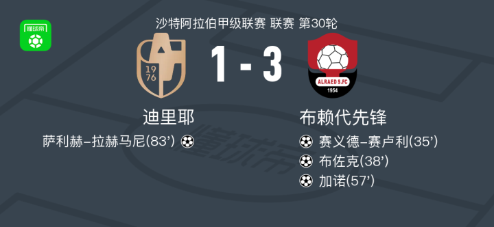 北京时间4月21日沙特阿拉伯甲级联赛 联赛 第30轮,迪里耶主场对阵布赖代先锋。迪里耶萨利赫-拉赫马尼破门。布赖代先锋赛义德-赛卢利破门,布佐克破门,加诺破门。最终比分迪里耶 1–3 布赖代先锋。