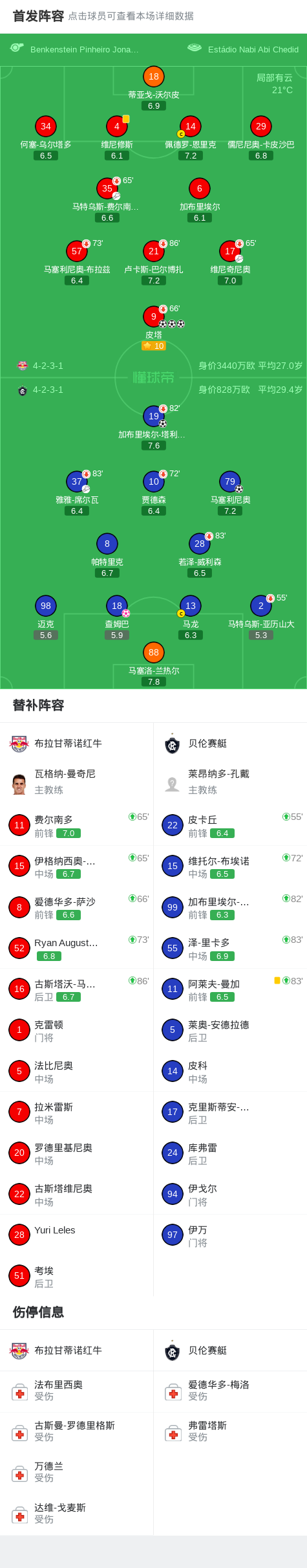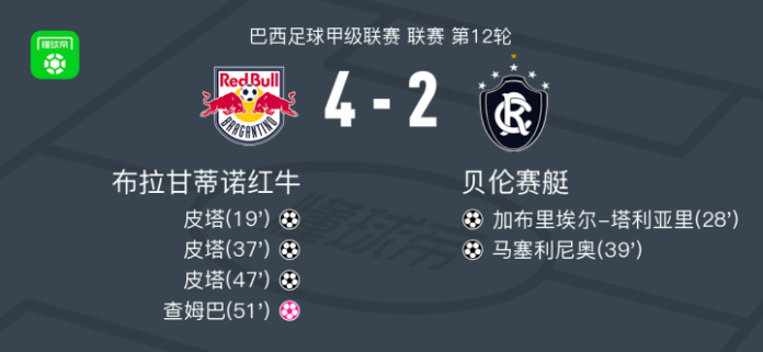 北京时间4月20日巴西足球甲级联赛 联赛 第12轮,布拉甘蒂诺红牛主场对阵贝伦赛艇。布拉甘蒂诺红牛皮塔帽子戏法。贝伦赛艇加布里埃尔-塔利亚里破门,马塞利尼奥破门,查姆巴自摆乌龙。最终比分布拉甘蒂诺 4–2 贝伦赛艇。