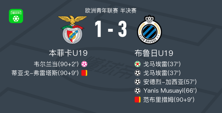 北京时间4月17日欧洲青年联赛 半决赛,本菲卡U19对阵布鲁日U19 。布鲁日U19 戈马埃雷破门,安德烈-加西亚破门,Yanis Musuayi破门,韦尔兰当自摆乌龙。最终比分本菲卡U19 1–3 布鲁日U19 。