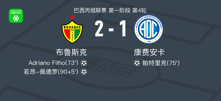北京时间4月26日巴西丙组联赛 第一阶段 第4轮,布鲁斯克主场对阵康费安卡。布鲁斯克Adriano Filho破门,若昂-佩德罗破门。康费安卡帕特里克破门。最终比分布鲁斯克 21 康费安卡。
