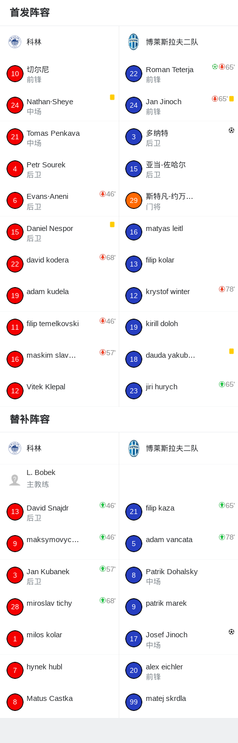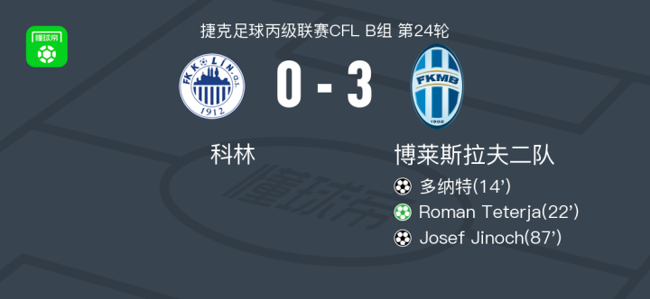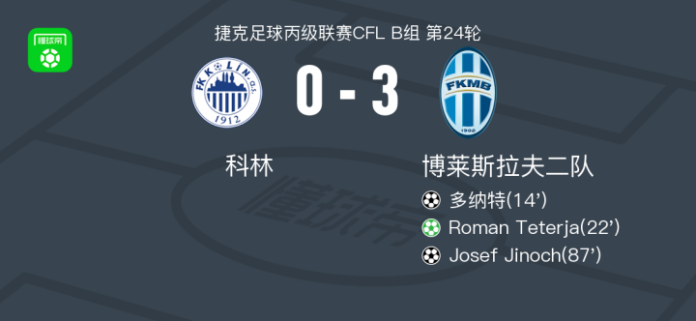 北京时间4月19日捷克足球丙级联赛CFL B组 第24轮,科林主场对阵博莱斯拉夫二队。博莱斯拉夫二队多纳特破门,Josef Jinoch破门,Roman Teterja破门。最终比分科林 0–3 博莱斯拉夫B队。