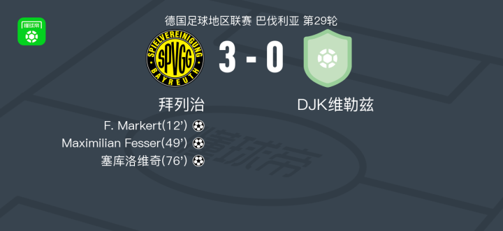 北京时间4月18日德国足球地区联赛 巴伐利亚 第29轮,拜列治主场对阵DJK维勒兹。拜列治F. Markert破门,Maximilian Fesser破门,塞库洛维奇破门。最终比分拜列治 3–0 DJK维勒兹。