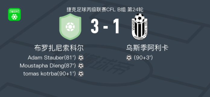 北京时间4月19日捷克足球丙级联赛CFL B组 第24轮,布罗扎尼索科尔主场对阵乌斯季阿利卡。布罗扎尼索科尔Adam Stauber破门,Moustapha Dieng破门,tomas kotrba破门。最终比分布罗扎尼索科尔 3–1 乌斯季阿利卡。