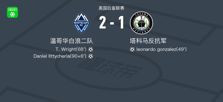 北京时间4月13日美国后备联赛,温哥华白浪二队对阵塔科马反抗军。温哥华白浪二队T. Wright破门,Daniel IIttycheria破门。塔科马反抗军leonardo gonzalez破门。最终比分白帽 21 塔科马反抗军。