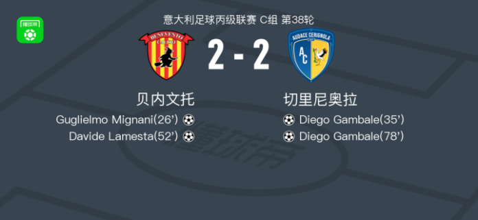 北京时间4月27日意大利足球丙级联赛 C组 第38轮,贝内文托主场对阵切里尼奥拉。贝内文托Guglielmo Mignani破门,Davide Lamesta破门。切里尼奥拉Diego Gambale梅开二度。最终比分贝内文托 2–2 切里尼奥拉。