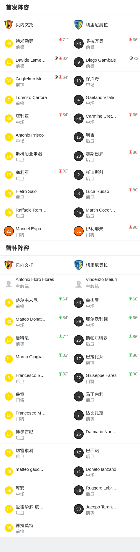 第52分钟,贝内文托球员Davide Lamesta打入一球。
