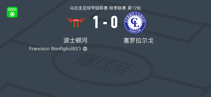 北京时间4月21日乌拉圭足球甲级联赛 秋季联赛 第12轮,波士顿河主场对阵塞罗拉尔戈。波士顿河Francisco Bonfiglio破门。最终比分波士顿河 1–0 塞罗拉尔戈。
