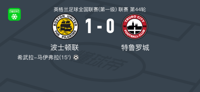 波士顿联1-0特鲁罗城,希武拉-马伊弗拉制胜 足球资讯 发布时间: 2026年4月12日 阅读时间: 少于1 分钟 FacebookXPinterestWhatsApp 波士顿联1-0特鲁罗城,希武拉-马伊弗拉制胜 北京时间4月11日英格兰足球全国联赛(第一级) 联赛 第44轮,波士顿联主场对阵特鲁罗城。波士顿联希武拉-马伊弗拉破门。最终比分波士顿联 1–0 特鲁罗城。 点击查看本场比赛详细数据>> 精彩瞬间 第15分钟,波士顿联球员拉维尼尔助攻希武拉-马伊弗拉打入一球。 球队阵容 技术统计 FacebookXPinterestWhatsApp 1823100https://1823100.com 红单推荐 023 英超 阿森纳vs纽卡斯尔 红单推荐 2026年4月25日 016 英超 狼队vs热刺 红单推荐 2026年4月25日 013 英超 桑德兰vs诺丁汉 红单推荐 2026年4月24日 014 西甲 贝蒂斯vs皇马 红单推荐 2026年4月24日 005 西甲 巴列卡诺vs西班牙人 红单推荐 2026年4月23日 热门资讯 003 西甲 莱万特vs塞维利亚 红单推荐 2026年4月23日 001 意甲 莱切vs佛罗伦萨 红单推荐 2026年4月20日 023 英超 阿森纳vs纽卡斯尔 红单推荐 2026年4月25日 003 英超 水晶宫vs西汉姆联 红单推荐 2026年4月20日 三人20+!火箭21分逆转太阳7连胜 KD24分阿门22+11+8 篮球资讯 2026年4月8日