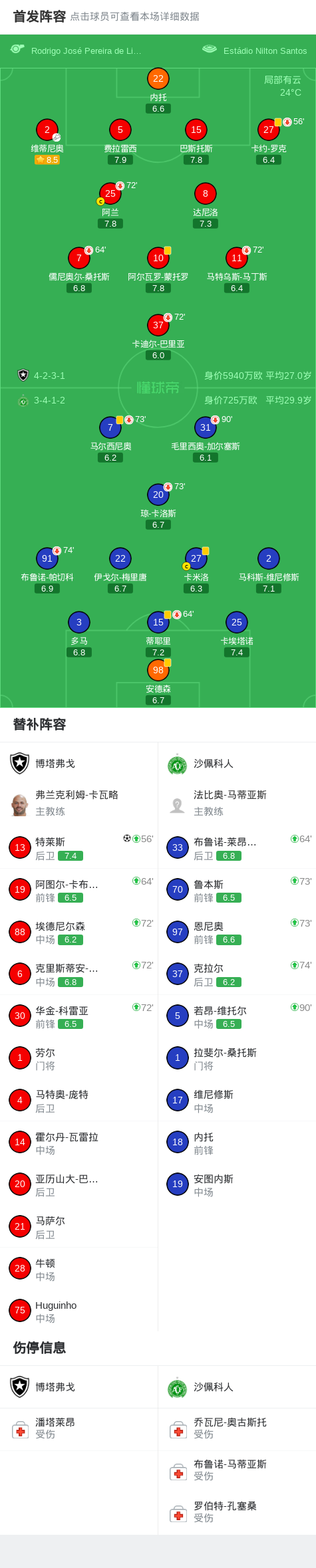 博塔弗戈1-0沙佩科人,特莱斯一锤定音 足球资讯 发布时间: 2026年4月22日 阅读时间: 少于1 分钟 FacebookXPinterestWhatsApp 博塔弗戈1-0沙佩科人,特莱斯一锤定音 北京时间4月22日巴西足球杯赛 第五轮首回合,博塔弗戈对阵沙佩科人。博塔弗戈特莱斯破门。最终比分博塔弗戈 1–0 沙佩科人。 点击查看本场比赛详细数据>> 点击查看巴西杯完整积分榜>> 精彩瞬间 下半场补时第1分钟,博塔弗戈球员维蒂尼奥助攻特莱斯打入一球。 球队阵容 技术统计 FacebookXPinterestWhatsApp 1823100https://1823100.com 红单推荐 007 意杯 国际米兰vs科莫 红单推荐 2026年4月21日 005 西甲 毕尔巴鄂竞技vs奥萨苏纳 红单推荐 2026年4月21日 001 意甲 莱切vs佛罗伦萨 红单推荐 2026年4月20日 003 英超 水晶宫vs西汉姆联 红单推荐 2026年4月20日 019 英超 曼城vs阿森纳 红单推荐 2026年4月19日 热门资讯 007 意杯 国际米兰vs科莫 红单推荐 2026年4月21日 019 英超 曼城vs阿森纳 红单推荐 2026年4月19日 007 英冠 伊普斯维奇vs米德尔斯堡 红单推荐 2026年4月19日 约基奇第198次三双!掘金大胜灰熊豪取10连胜 穆雷26+7+5 篮球资讯 2026年4月9日 马卡:巴萨进入“换代期”,五位球员或将离队 足球资讯 2026年4月21日