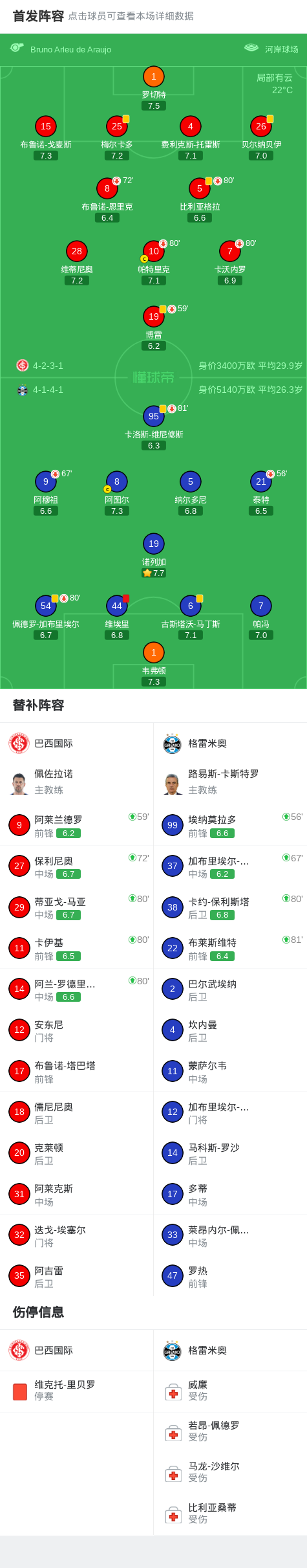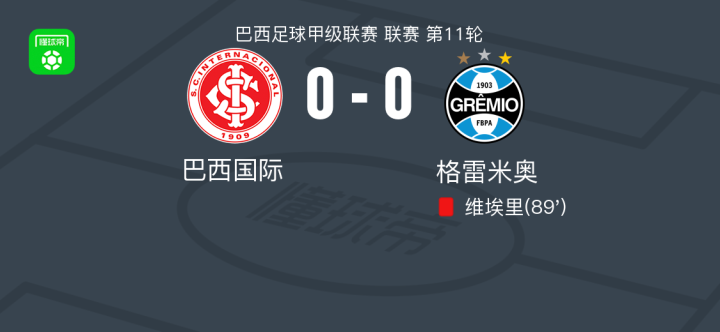 巴西国际0-0格雷米奥,双方互交白卷 足球资讯 发布时间: 2026年4月12日 阅读时间: 少于1 分钟 FacebookXPinterestWhatsApp 巴西国际0-0格雷米奥,双方互交白卷 北京时间4月12日巴西足球甲级联赛 联赛 第11轮,巴西国际主场对阵格雷米奥。最终比分巴西国际 0–0 格雷米奥。 点击查看本场比赛详细数据>> 点击查看巴甲完整积分榜>> 精彩瞬间 第89分钟,格雷米奥球队维埃里吃到红牌。 球队阵容 技术统计 FacebookXPinterestWhatsApp 1823100https://1823100.com 红单推荐 023 英超 阿森纳vs纽卡斯尔 红单推荐 2026年4月25日 016 英超 狼队vs热刺 红单推荐 2026年4月25日 013 英超 桑德兰vs诺丁汉 红单推荐 2026年4月24日 014 西甲 贝蒂斯vs皇马 红单推荐 2026年4月24日 005 西甲 巴列卡诺vs西班牙人 红单推荐 2026年4月23日 热门资讯 约基奇第198次三双!掘金大胜灰熊豪取10连胜 穆雷26+7+5 篮球资讯 2026年4月9日 023 英超 阿森纳vs纽卡斯尔 红单推荐 2026年4月25日 005 西甲 巴列卡诺vs西班牙人 红单推荐 2026年4月23日 002 欧协联 巴列卡诺vs雅典AEK 红单推荐 2026年4月9日 003 西甲 莱万特vs塞维利亚 红单推荐 2026年4月23日