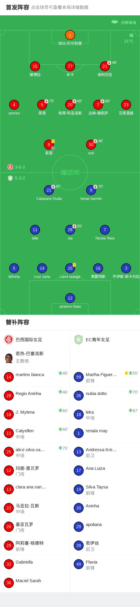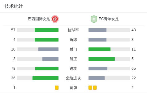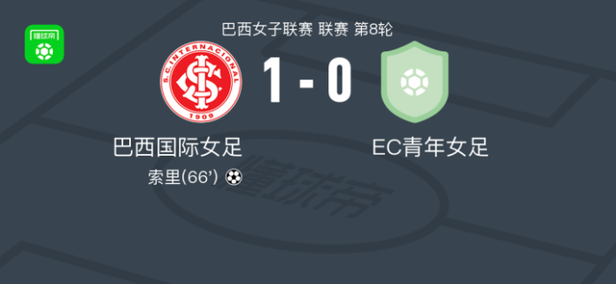 巴西国际女足1-0EC青年女足,索里一击制胜 足球资讯 发布时间: 2026年4月26日 阅读时间: 少于1 分钟 FacebookXPinterestWhatsApp 巴西国际女足1-0EC青年女足,索里一击制胜 北京时间4月26日巴西女子联赛 联赛 第8轮,巴西国际女足主场对阵EC青年女足。巴西国际女足索里破门。最终比分巴西国际女足 1–0 EC青年女足。 点击查看本场比赛详细数据>> 精彩瞬间 第66分钟,巴西国际女足球员索里打入一球。 球队阵容 技术统计 FacebookXPinterestWhatsApp 1823100https://1823100.com 红单推荐 023 英超 阿森纳vs纽卡斯尔 红单推荐 2026年4月25日 016 英超 狼队vs热刺 红单推荐 2026年4月25日 013 英超 桑德兰vs诺丁汉 红单推荐 2026年4月24日 014 西甲 贝蒂斯vs皇马 红单推荐 2026年4月24日 005 西甲 巴列卡诺vs西班牙人 红单推荐 2026年4月23日 热门资讯 三人20+!火箭21分逆转太阳7连胜 KD24分阿门22+11+8 篮球资讯 2026年4月8日 约基奇第198次三双!掘金大胜灰熊豪取10连胜 穆雷26+7+5 篮球资讯 2026年4月9日 004 欧冠 巴萨vs马竞 红单推荐 2026年4月8日 002 欧协联 巴列卡诺vs雅典AEK 红单推荐 2026年4月9日 003 欧冠 利物浦vs巴黎圣日耳曼 红单推荐 2026年4月14日