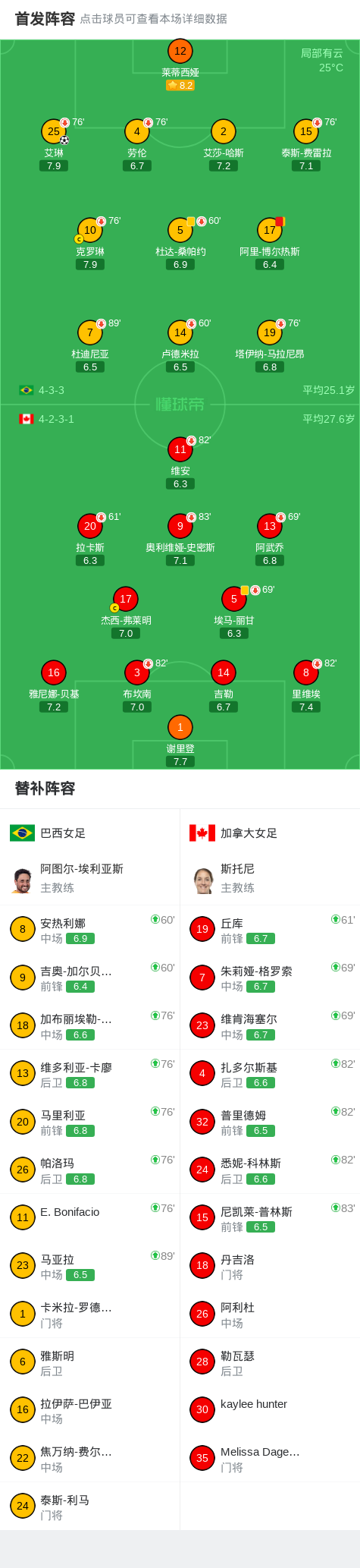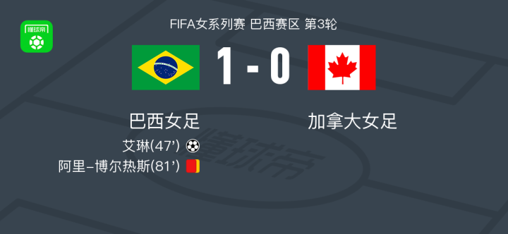 巴西女足1-0加拿大女足,艾琳一剑封喉 足球资讯 发布时间: 2026年4月19日 阅读时间: 少于1 分钟 FacebookXPinterestWhatsApp 巴西女足1-0加拿大女足,艾琳一剑封喉 北京时间4月19日FIFA女系列赛 巴西赛区 第3轮,巴西女足对阵加拿大女足。巴西女足艾琳破门。最终比分巴西女足 1–0 加拿大女足。 点击查看本场比赛详细数据>> 精彩瞬间 第47分钟,巴西女足球员艾琳打入一球。 第81分钟,巴西女足球队阿里-博尔热斯吃到第二张黄牌。 球队阵容 技术统计 FacebookXPinterestWhatsApp 1823100https://1823100.com 红单推荐 005 西甲 巴列卡诺vs西班牙人 红单推荐 2026年4月23日 003 西甲 莱万特vs塞维利亚 红单推荐 2026年4月23日 015 西甲 巴萨vs塞尔塔 红单推荐 2026年4月22日 012 英超 伯恩茅斯vs利兹联 红单推荐 2026年4月22日 007 意杯 国际米兰vs科莫 红单推荐 2026年4月21日 热门资讯 萨拉戈萨U19 0-0乌德山U19,双方握手言和 足球资讯 2026年4月12日 萨拉赫安菲尔德英超进108球,联赛历史单座球场进球仅次于亨利 足球资讯 2026年4月12日 萨拉赫英超打入157粒非点球进球,追平阿圭罗列历史第五 足球资讯 2026年4月12日 郑大世:森保一执教风格很有人情味;日本队还得日本人执教 足球资讯 2026年4月23日 萨拉赫英超参与250粒非点球进球,成历史第五人 足球资讯 2026年4月12日