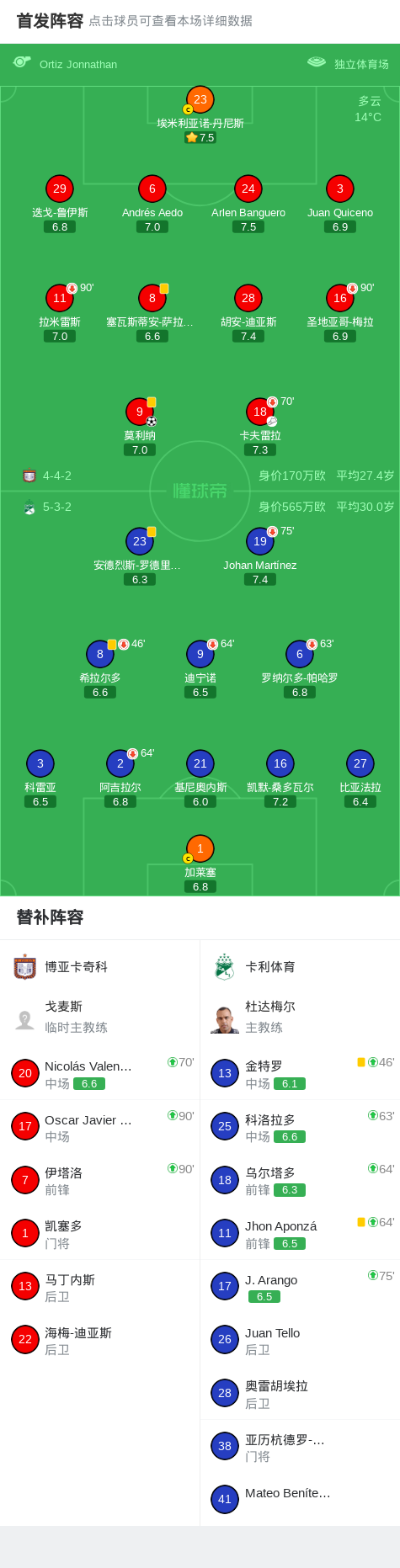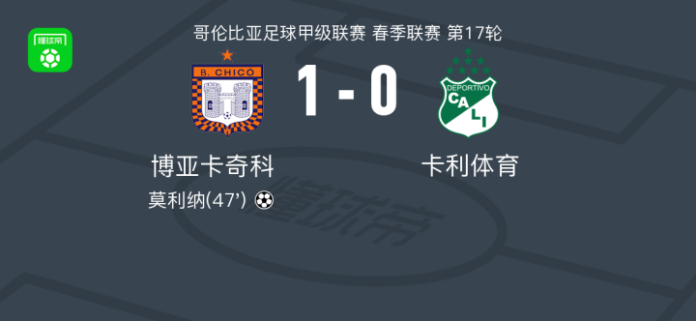 博亚卡奇科1-0卡利体育,莫利纳制胜球 足球资讯 发布时间: 2026年4月18日 阅读时间: 少于1 分钟 FacebookXPinterestWhatsApp 博亚卡奇科1-0卡利体育,莫利纳制胜球 北京时间4月18日哥伦比亚足球甲级联赛 春季联赛 第17轮,博亚卡奇科主场对阵卡利体育。博亚卡奇科莫利纳破门。最终比分博亚卡奇科 1–0 卡利体育。 点击查看本场比赛详细数据>> 点击查看哥伦甲完整积分榜>> 精彩瞬间 第47分钟,博亚卡奇科球员卡夫雷拉助攻莫利纳打入一球。 球队阵容 技术统计 FacebookXPinterestWhatsApp 1823100https://1823100.com 红单推荐 007 意杯 国际米兰vs科莫 红单推荐 2026年4月21日 005 西甲 毕尔巴鄂竞技vs奥萨苏纳 红单推荐 2026年4月21日 001 意甲 莱切vs佛罗伦萨 红单推荐 2026年4月20日 003 英超 水晶宫vs西汉姆联 红单推荐 2026年4月20日 019 英超 曼城vs阿森纳 红单推荐 2026年4月19日 热门资讯 004 欧冠 巴萨vs马竞 红单推荐 2026年4月8日 三人20+!火箭21分逆转太阳7连胜 KD24分阿门22+11+8 篮球资讯 2026年4月8日 007 意杯 国际米兰vs科莫 红单推荐 2026年4月21日 005 西甲 毕尔巴鄂竞技vs奥萨苏纳 红单推荐 2026年4月21日 马卡:巴萨进入“换代期”,五位球员或将离队 足球资讯 2026年4月21日
