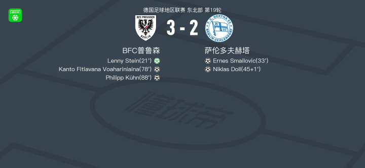 北京时间4月22日德国足球地区联赛 东北部 第19轮,BFC普鲁森主场对阵萨伦多夫赫塔。BFC普鲁森Lenny Stein破门,Kanto Fitiavana Voahariniaina破门,Philipp Kühn破门。萨伦多夫赫塔Ernes Smailovic破门,Niklas Doll破门。最终比分BFC普鲁森 3–2 萨伦多夫赫塔。