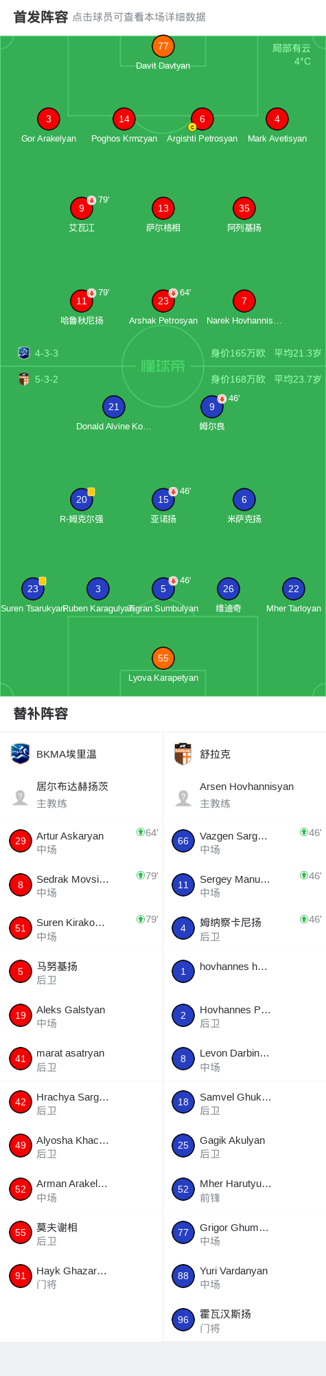 BKMA埃里温0-0舒拉克,双方握手言和 足球资讯 发布时间: 2026年4月12日 阅读时间: 少于1 分钟 FacebookXPinterestWhatsApp BKMA埃里温0-0舒拉克,双方握手言和 北京时间4月12日亚美尼亚足球超级联赛 联赛 第21轮,BKMA埃里温主场对阵舒拉克。最终比分BKMA埃里温 0–0 舒拉克。 点击查看本场比赛详细数据>> 点击查看亚美超完整积分榜>> 球队阵容 技术统计 FacebookXPinterestWhatsApp 1823100https://1823100.com 红单推荐 002 欧联 诺丁汉vs波尔图 红单推荐 2026年4月16日 001 欧联杯 塞尔塔vs弗莱堡 红单推荐 2026年4月16日 006 欧冠 拜仁vs皇马 红单推荐 2026年4月15日 003 欧冠 利物浦vs巴黎圣日耳曼 红单推荐 2026年4月14日 005 英超 曼联vs利兹联 红单推荐 2026年4月13日 热门资讯 013 英超 西汉姆联vs狼队 红单推荐 2026年4月10日 003 欧冠 利物浦vs巴黎圣日耳曼 红单推荐 2026年4月14日 006 欧冠 拜仁vs皇马 红单推荐 2026年4月15日 002 欧协联 巴列卡诺vs雅典AEK 红单推荐 2026年4月9日 001 欧联杯 塞尔塔vs弗莱堡 红单推荐 2026年4月16日