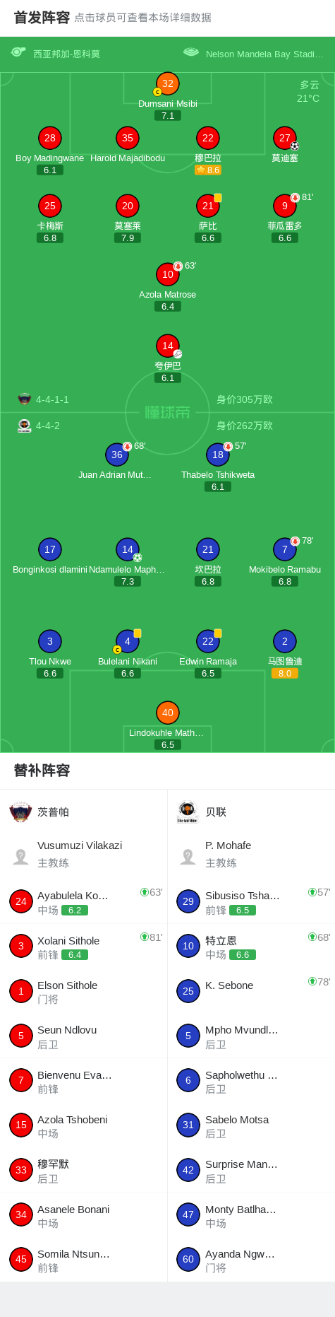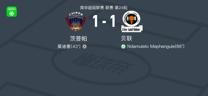 北京时间4月12日南非超级联赛 联赛 第24轮,茨普帕主场对阵贝联。茨普帕莫迪塞破门。贝联Ndamulelo Maphangule破门。最终比分茨普帕 11 贝联。