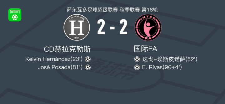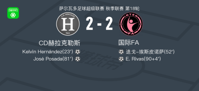 北京时间4月13日萨尔瓦多足球超级联赛 秋季联赛 第18轮,CD赫拉克勒斯主场对阵国际FA。CD赫拉克勒斯Kelvin Hernández破门,José Posada破门。国际FA迭戈-埃斯皮诺萨破门,E. Rivas破门。最终比分CD赫拉克勒斯 2–2 国际FA。