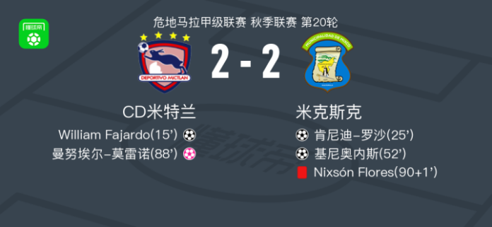 北京时间4月17日危地马拉甲级联赛 秋季联赛 第20轮,CD米特兰主场对阵米克斯克。CD米特兰William Fajardo破门。米克斯克肯尼迪-罗沙破门,基尼奥内斯破门,曼努埃尔-莫雷诺自摆乌龙。最终比分CD米特兰 22 米克斯克。