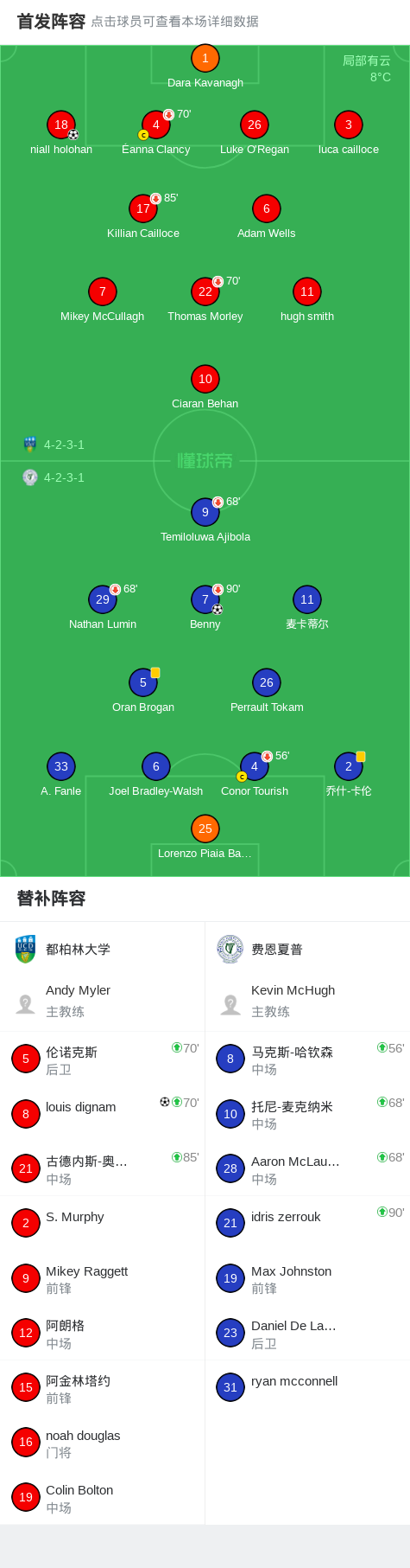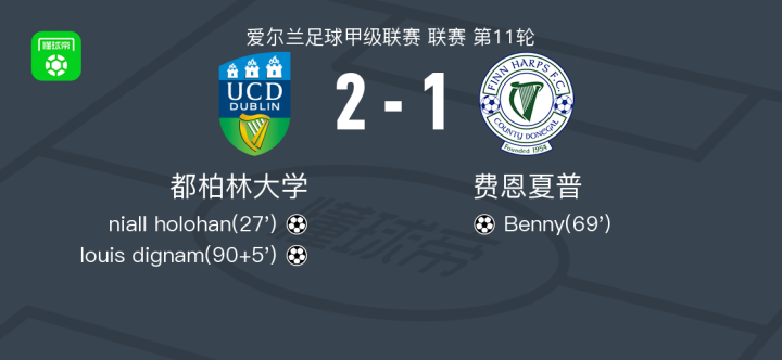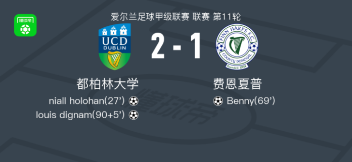 北京时间4月18日爱尔兰足球甲级联赛 联赛 第11轮,都柏林大学主场对阵费恩夏普。都柏林大学niall holohan破门,louis dignam破门。费恩夏普Benny破门。最终比分都柏林大学 2–1 费恩夏普。