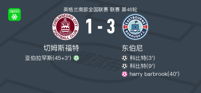 北京时间4月25日英格兰南部全国联赛 联赛 第46轮,切姆斯福特主场对阵东伯尼。切姆斯福特亚伯拉罕斯破门,harry barbrook自摆乌龙。东伯尼科比特梅开二度。最终比分切姆斯福特 1–3 东伯尼。