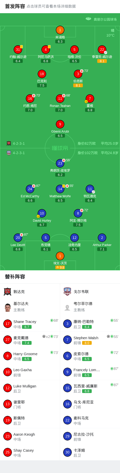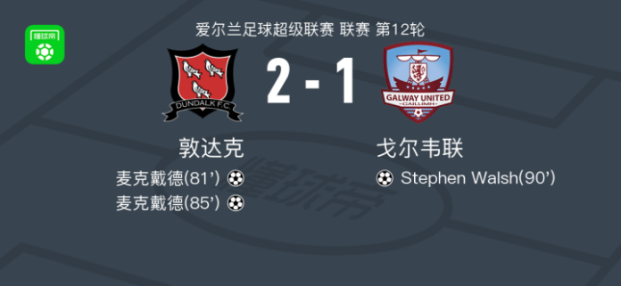 北京时间4月18日爱尔兰足球超级联赛 联赛 第12轮,敦达克主场对阵戈尔韦联。敦达克麦克戴德梅开二度。戈尔韦联Stephen Walsh破门。最终比分敦达克 21 戈尔韦联。