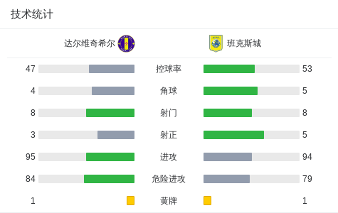 达尔维奇希尔0-0班克斯城,双方互有攻守
