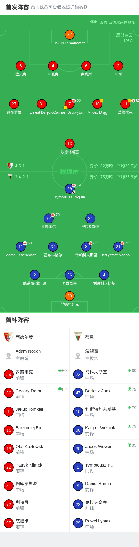 蒂黑1-0西德尔策,Tymoteusz Ryguła制胜球 足球资讯 发布时间: 2026年4月12日 阅读时间: 少于1 分钟 FacebookXPinterestWhatsApp 蒂黑1-0西德尔策,Tymoteusz Ryguła制胜球 北京时间4月12日波兰足球甲级联赛 联赛 第28轮,西德尔策主场对阵蒂黑。蒂黑Tymoteusz Ryguła破门。最终比分西德尔策 0–1 蒂黑。 点击查看本场比赛详细数据>> 精彩瞬间 第76分钟,蒂黑球员Tymoteusz Ryguła打入一球。 球队阵容 技术统计 FacebookXPinterestWhatsApp 1823100https://1823100.com 红单推荐 021 西甲 奥萨苏纳vs塞维利亚 红单推荐 2026年4月26日 013 英足总杯 切尔西(中)vs利兹联 红单推荐 2026年4月26日 023 英超 阿森纳vs纽卡斯尔 红单推荐 2026年4月25日 016 英超 狼队vs热刺 红单推荐 2026年4月25日 013 英超 桑德兰vs诺丁汉 红单推荐 2026年4月24日 热门资讯 三人20+!火箭21分逆转太阳7连胜 KD24分阿门22+11+8 篮球资讯 2026年4月8日 约基奇第198次三双!掘金大胜灰熊豪取10连胜 穆雷26+7+5 篮球资讯 2026年4月9日 004 欧冠 巴萨vs马竞 红单推荐 2026年4月8日 002 欧协联 巴列卡诺vs雅典AEK 红单推荐 2026年4月9日 003 欧冠 利物浦vs巴黎圣日耳曼 红单推荐 2026年4月14日
