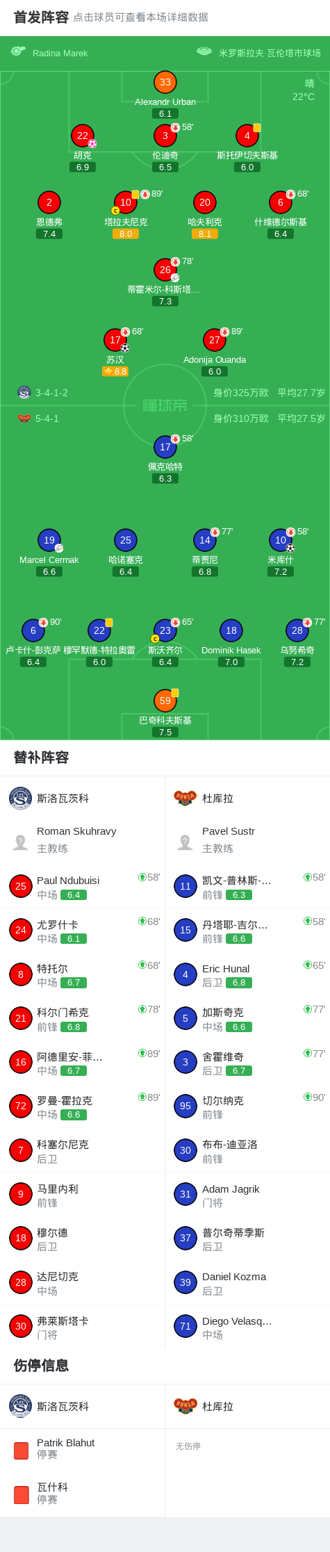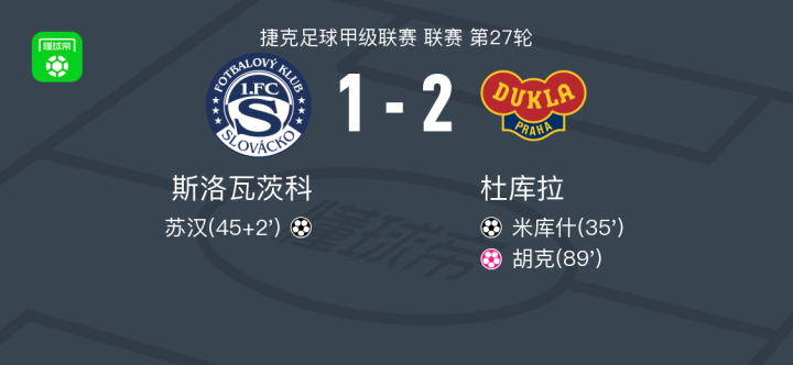 北京时间4月25日捷克足球甲级联赛 联赛 第27轮,斯洛瓦茨科主场对阵杜库拉。斯洛瓦茨科苏汉破门,胡克自摆乌龙。杜库拉米库什破门。最终比分斯洛瓦茨科 1–2 杜库拉。