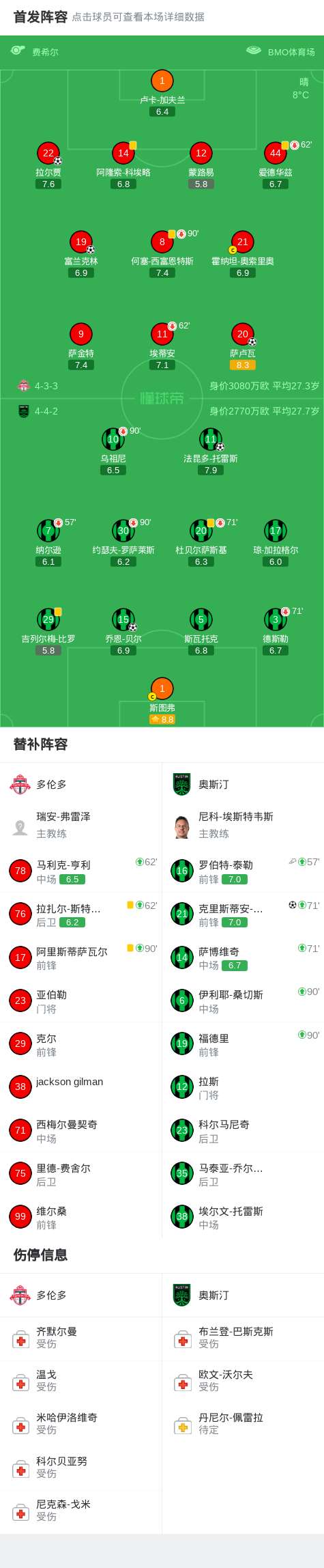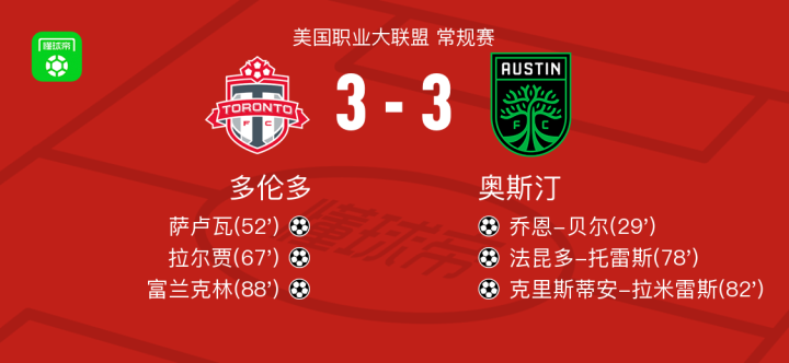北京时间4月19日美国职业大联盟 常规赛,多伦多主场对阵奥斯汀。多伦多萨卢瓦破门,拉尔贾破门,富兰克林破门。奥斯汀乔恩-贝尔破门,法昆多-托雷斯破门,克里斯蒂安-拉米雷斯破门。最终比分多伦多 3–3 奥斯汀。