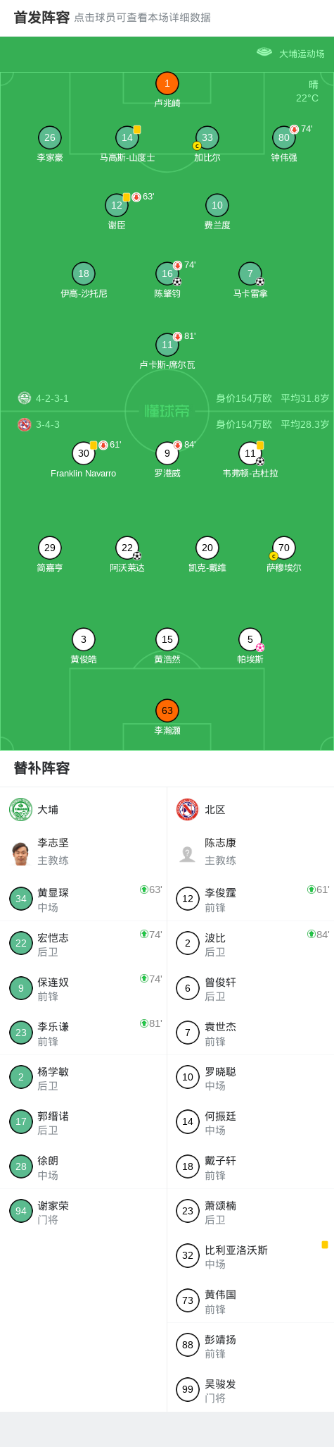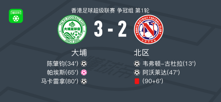 北京时间4月18日香港足球超级联赛 争冠组 第1轮,大埔主场对阵北区。大埔陈肇钧破门,马卡雷拿破门。北区韦弗顿-古杜拉破门,阿沃莱达破门,帕埃斯自摆乌龙。最终比分大埔 32 北区。