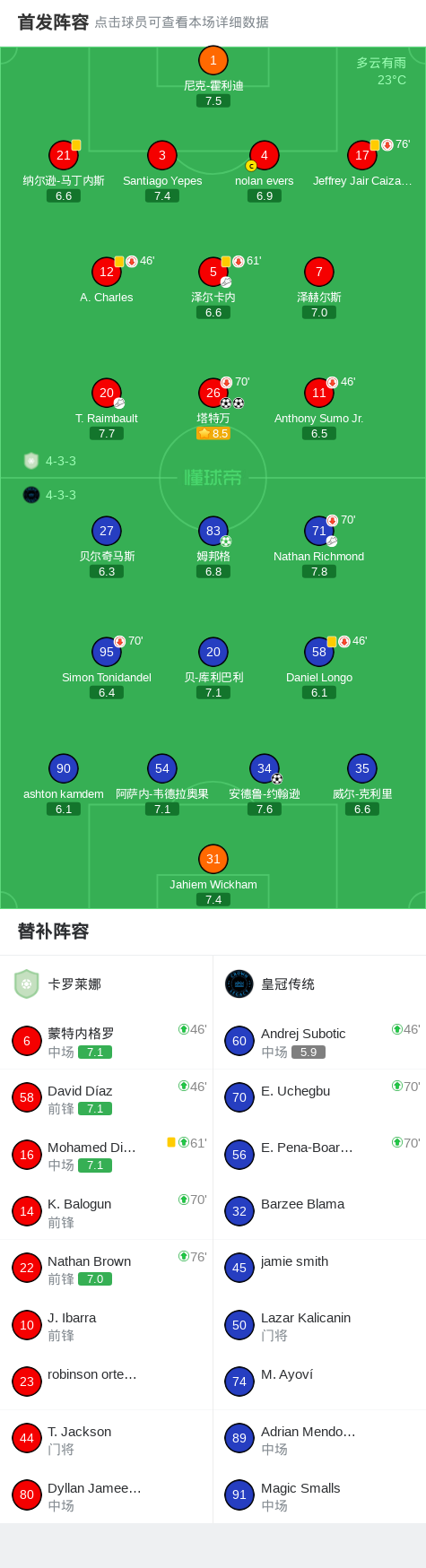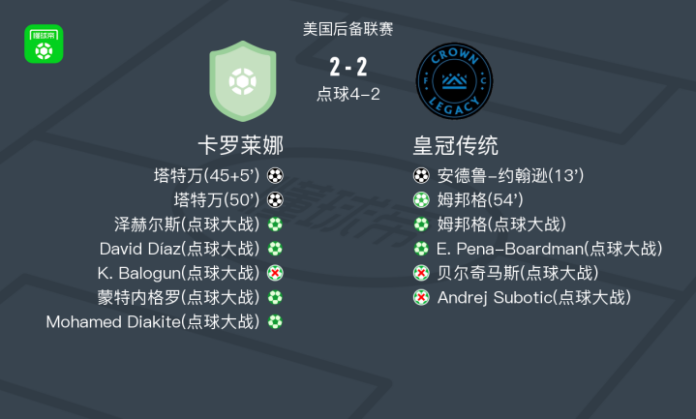 北京时间4月26日美国后备联赛,卡罗莱娜对阵皇冠传统。卡罗莱娜塔特万梅开二度。皇冠传统安德鲁-约翰逊破门,姆邦格破门。最终比分卡罗莱娜 6–4 皇冠传统。