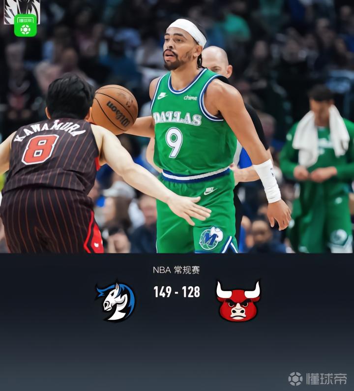 第四节独行侠AJ-约翰逊拿下7分,公牛河村勇辉拿下14分,最终独行侠149-128战胜公牛