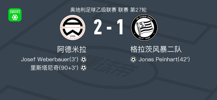 北京时间4月26日奥地利足球乙级联赛 联赛 第27轮,阿德米拉主场对阵格拉茨风暴二队。阿德米拉Josef Weberbauer破门,里斯塔尼奇破门。格拉茨风暴二队Jonas Peinhart破门。最终比分阿德米拉 21 格拉茨飓风B队。